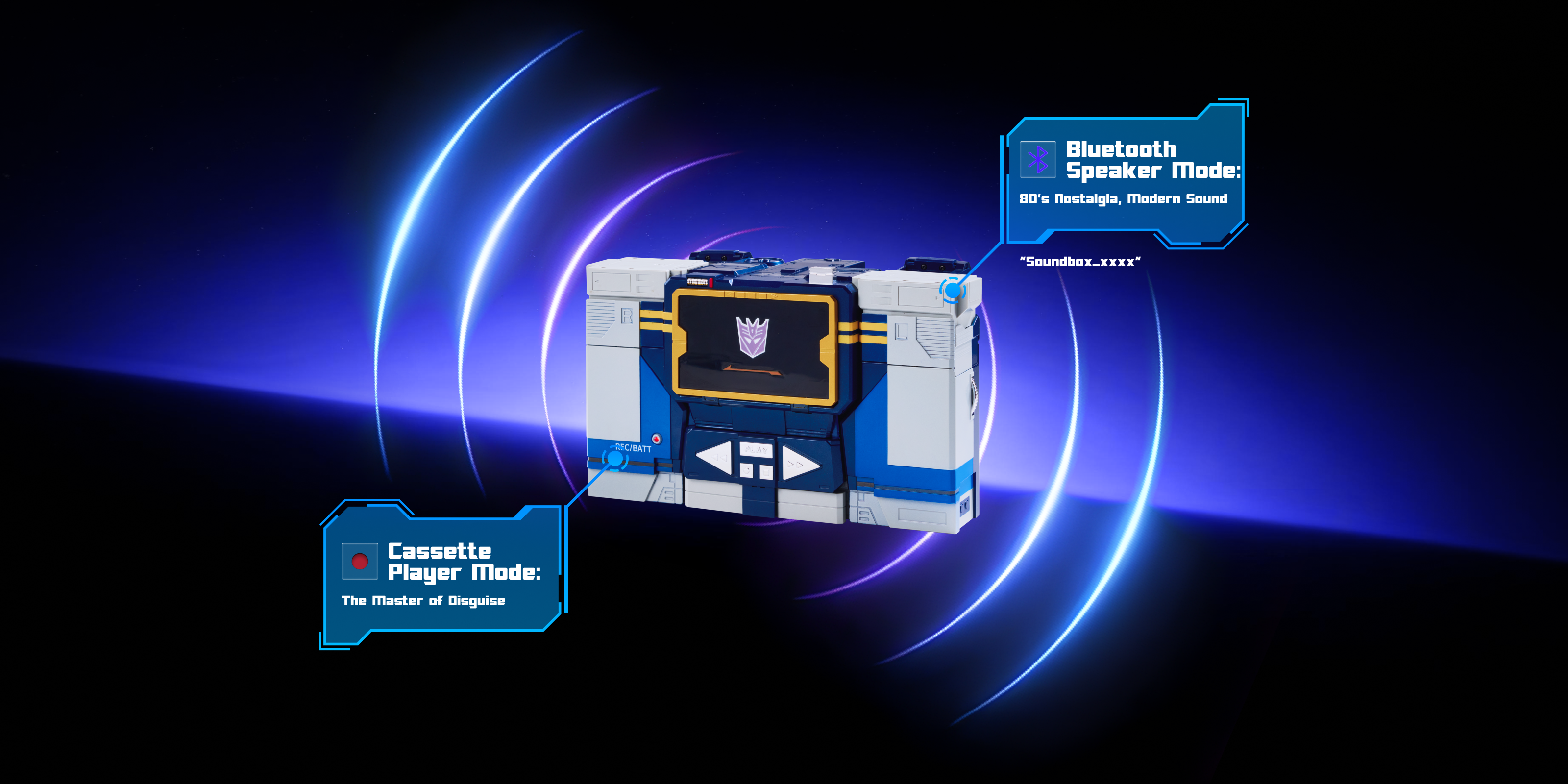Staying true to the classic G1 design while in Cassette Mode, Soundwave features a stealth black tape deck cover adorned with the Decepticon logo. Blending 80's nostalgia and modern design, red lit accents are highlighted by premium materials like zinc alloy, aluminum and ABS, for a perfectly recreated TRANSFORMER.